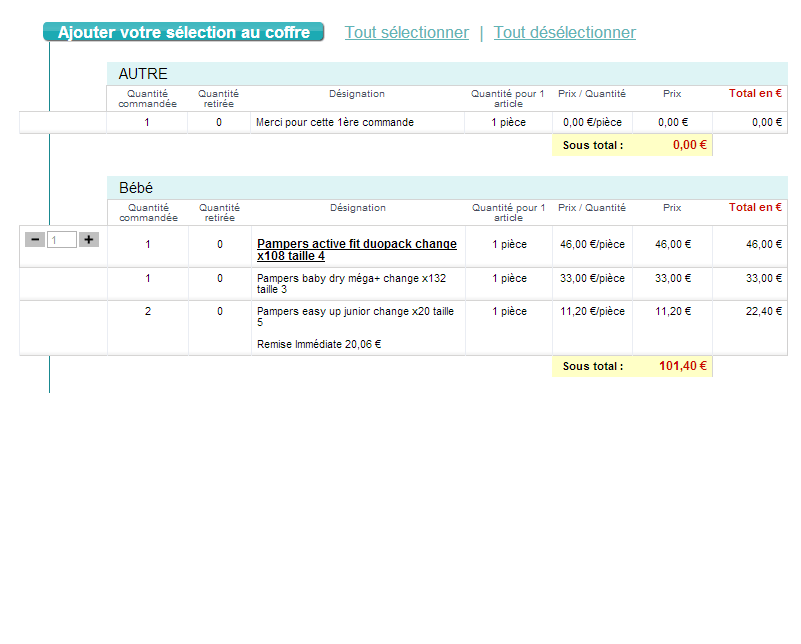 Moi aussi j'ai eu la linge "merci pour cette première commande", quantitié 1 prix 0 mais à part les couches je n'ai rien eu d'autre. Cela dit, je préfère les 8 euros de réduction, lol!