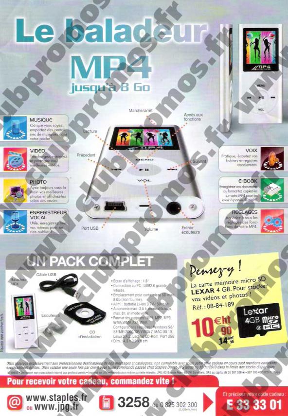 Sur staples.fr ou jpg.fr, un baladeur MP4 offert pour toute commande sans mini.