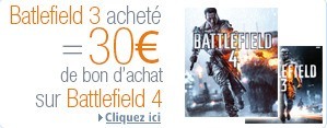 Jusqu'au 17 juin sur Amazon, pour 1 Jeu Batllefiel 3 acheté, vous obtenez 30€ en bon d'achat à valoir sur le jeu Batelfiel4.Le code promo est envoyé par e-mail une fois la commande du Battefield3 expédié.