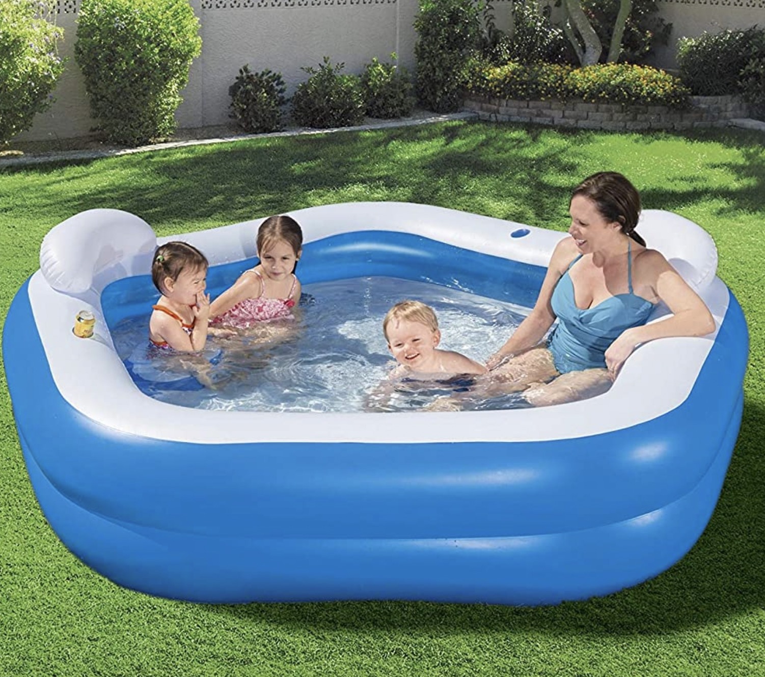 Je te propose cette piscine gonflable octogonale dotée de s sièges et appuie-têtes intégrés. Elle est aussi très pratique puisqu'elle comprend des porte-gobelets & coussins. Tout aussi facile à gonfler qu'à vider grâce à ses valves rapides, Elle est fabriquée en vinyle résistant et peut contenir jusqu’à 575 litres d’eau.