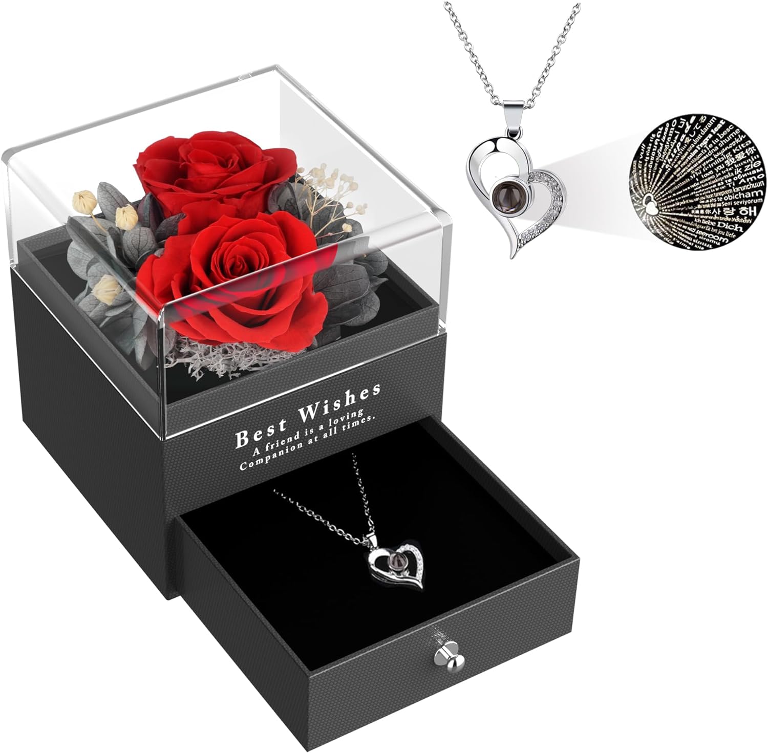 【Boîte-cadeau de la Saint-Valentin avec tiroir】 Les rose eternel sont emballées dans une élégante boîte-cadeau avec un petit tiroir. La boîte est durable et offre une bonne protection pour vos collier femme ou autres petits accessoires (tels que bagues et boucles d'oreilles).Elle convient très bien aux boîtes à bijoux, porte-bagues, idee cadeau femme, cadeau maman