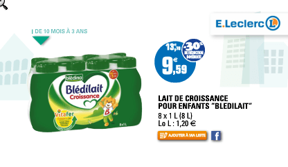 Le bledilait croissance en poudre par lot de deux sera en promotion la semaine prochaine chez Super U, catalogue mois du bébé, son prix sera inférieur à 9 neuf euros. Je ne sais pas si le catalogue est déjà dispo en ligne, je l'ai vu puisqu'une amie distribue les publicités et me les ramène en avance.