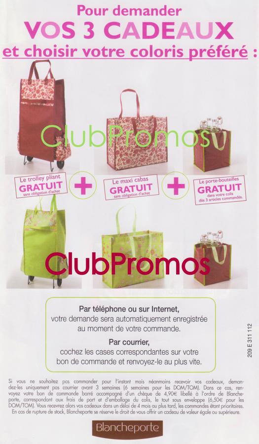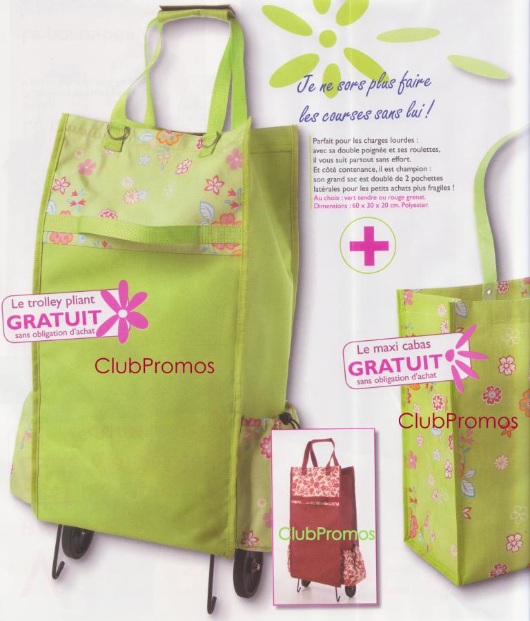 Avec le code 306101 chez blanche porte vous aurez le droit a un cabas, un trolley pliant et un porte bouteille( pour 3 articles) Couleurs dispo rouge ou vert.frais de port 5.20