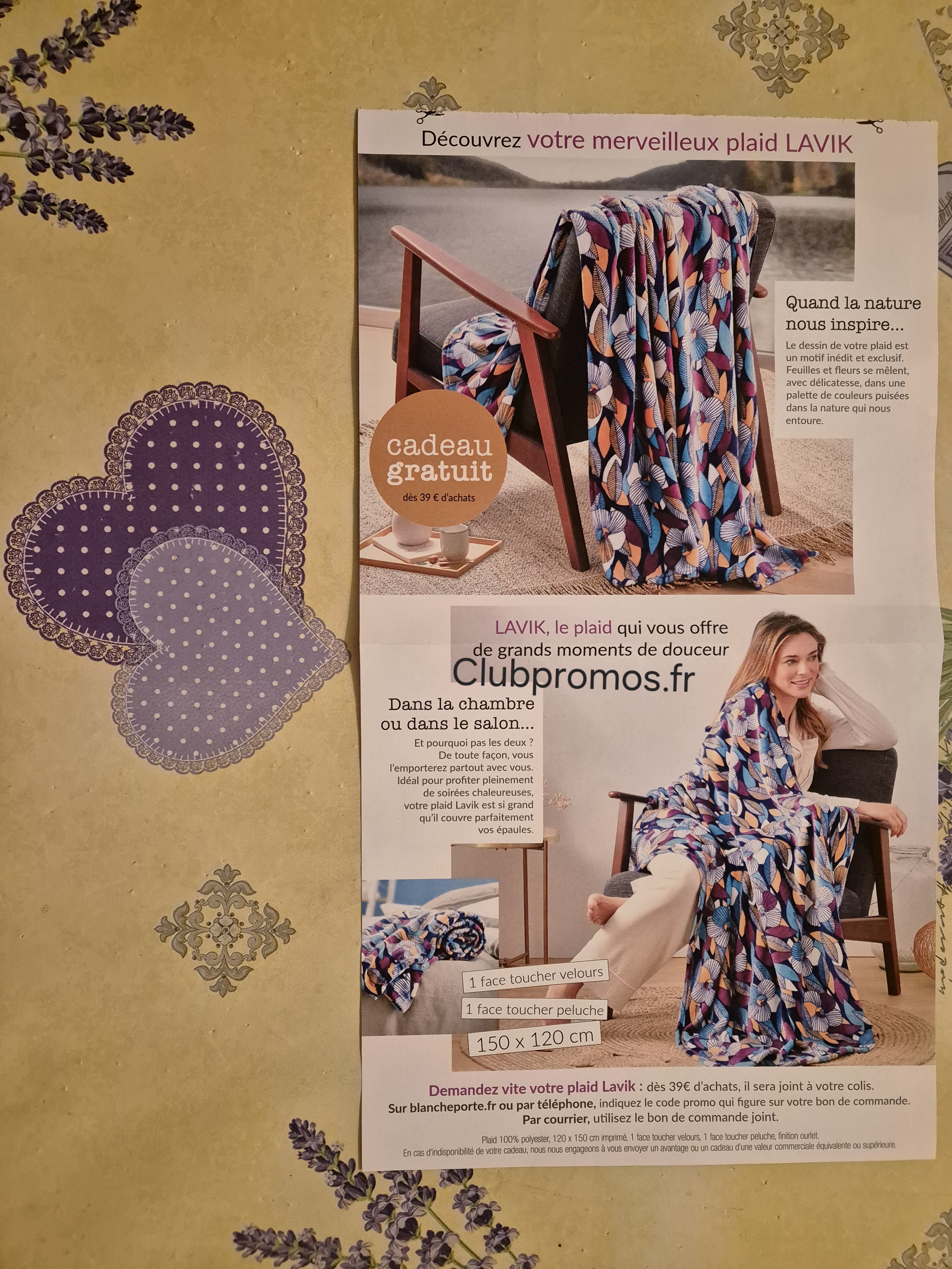 de chez Blanche Porte qui donne en cadeaudès 39 euros d'achats un joli plaid "Lavik", matière : 100% polyester, 1 face toucher velours et 1 face toucher peluche, dimensions : 120 × 150 cm, voir photos