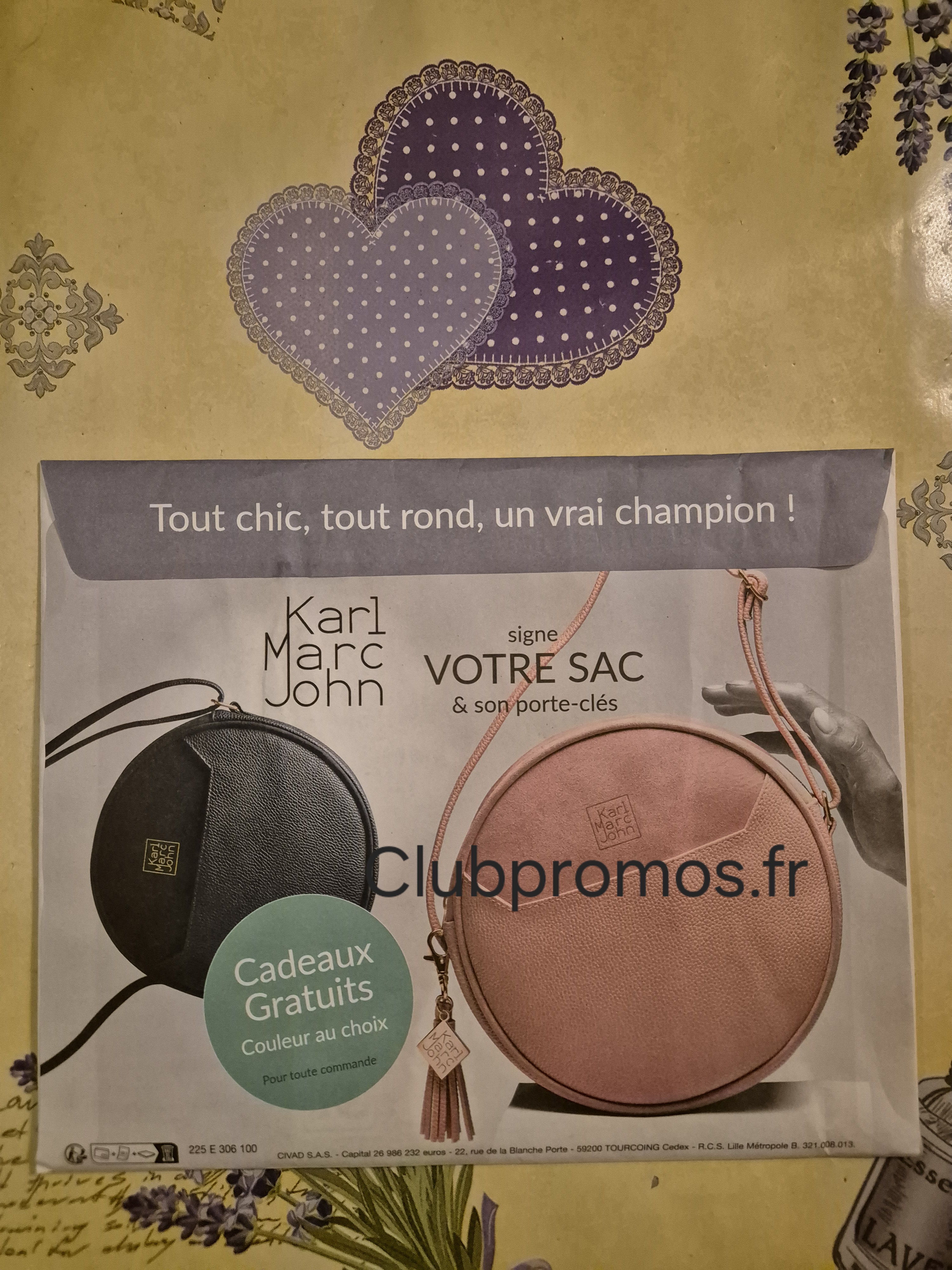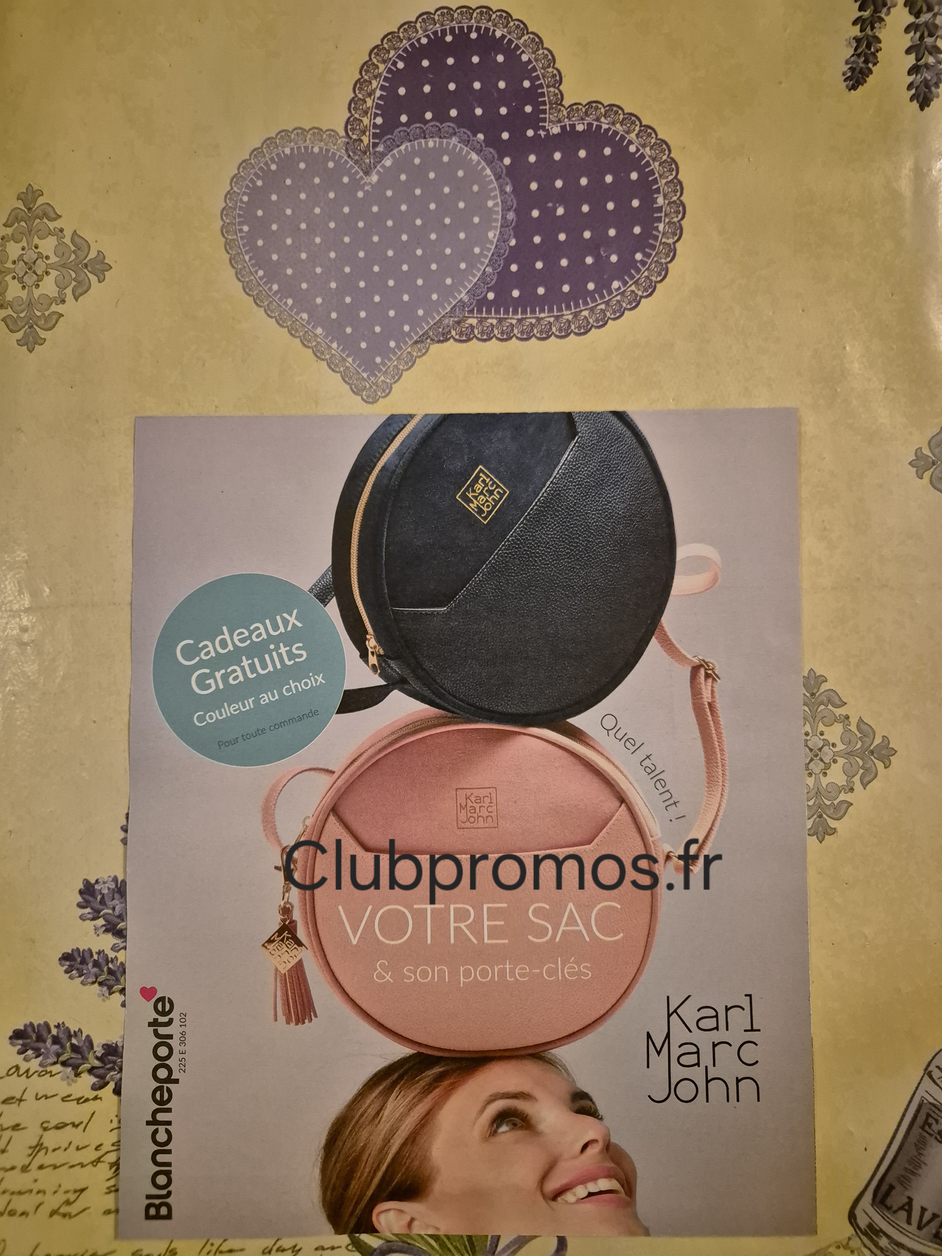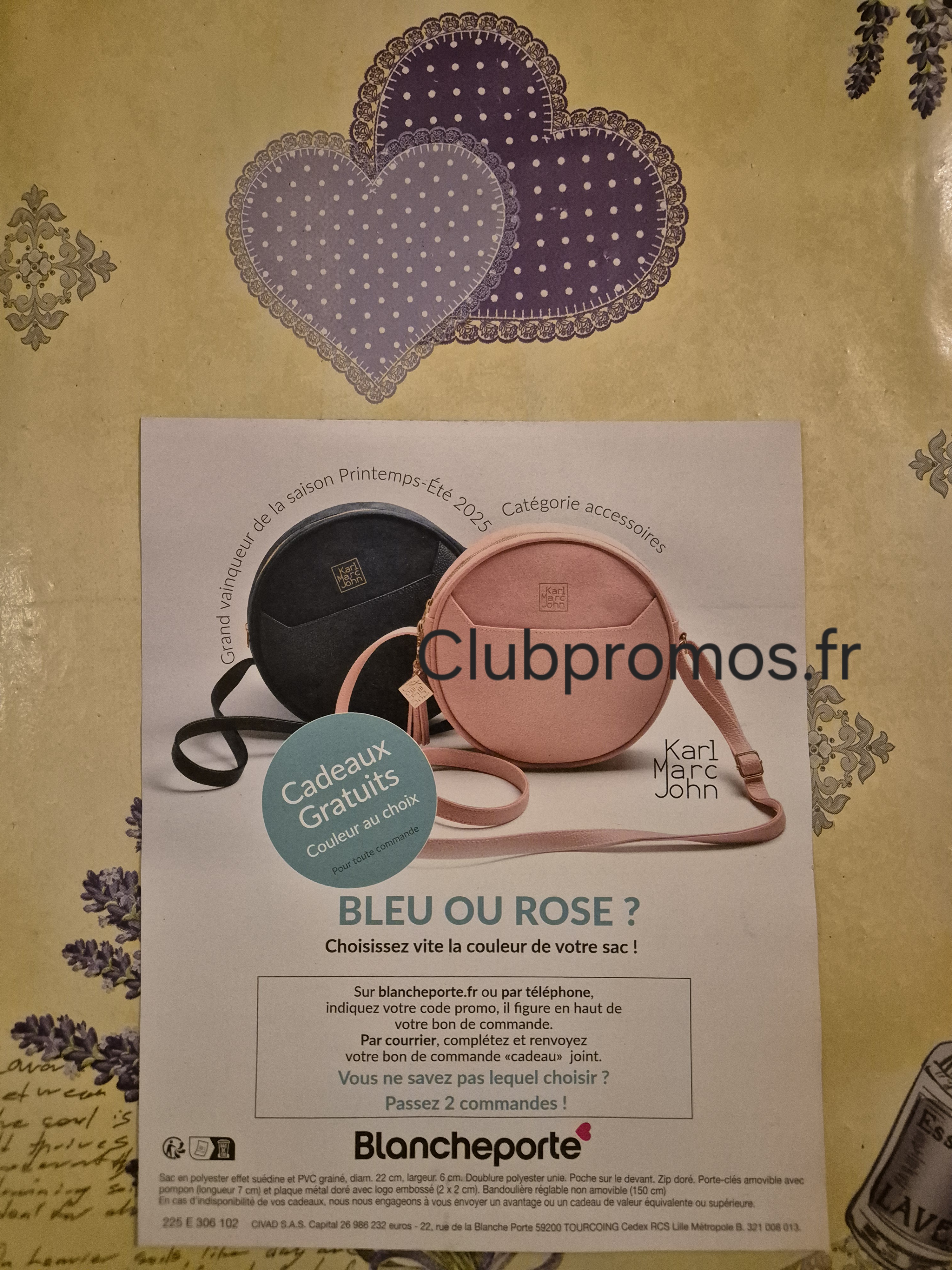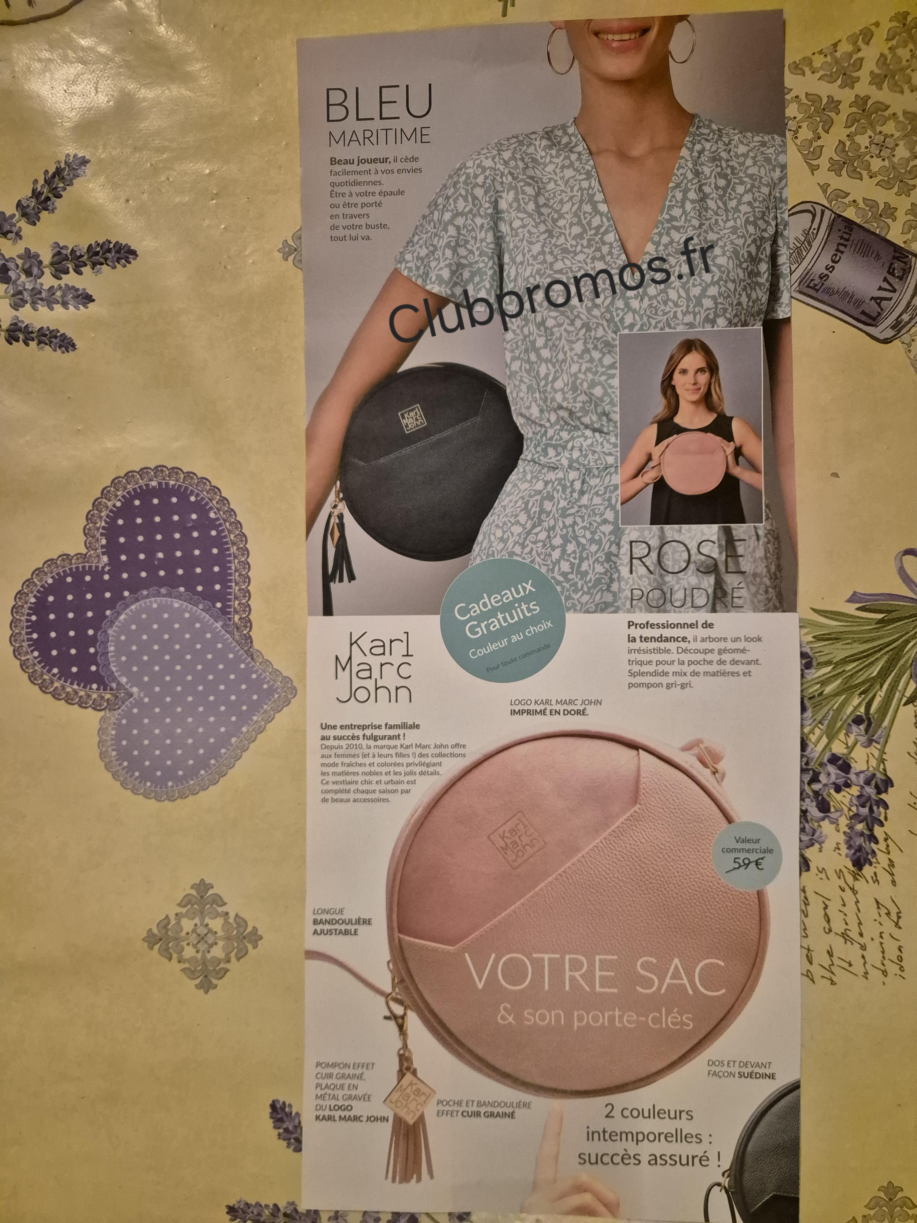de chez Blanche Porte qui donne en cadeau 🎁 pour toute commande un joli sac et son porte-clés assorti "Karl Marc John" (de retour 😉), dimensions du sac : diamètre : 22 cm, largeur : 6 cm et dimensions du porte-clés : longueur : 7 cm, voir photos 📷. Il y a aussi une remise de 30% sur votre commande.
