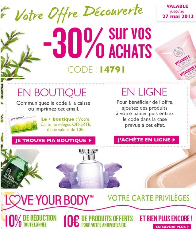 Offre découverte The Body Shop, valable jusqu'au 27 mai, 30% de réduction sur vos achats et la carte privilèges d'une valeur de 10 € offerte (en boutique).
