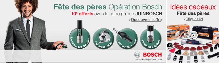 C'est l'opération Bosh fête des pères sur Amazon jusqu'au 30 juin 2014.Pour l'achat combiné d'une visseuse Bosch IXO (référence 0603981000, 0603981001 ou 0603981000) avec un embout original (Bosch Cutter 1600A001YF, Bosch Vino 1600A001YD, Bosch Barbecue 1600A001YC ou Bosch Spice 1600A001YE), bénéficiez d'une réduction de 10€ avec le code de réduction Amazon : JUINBOSCH