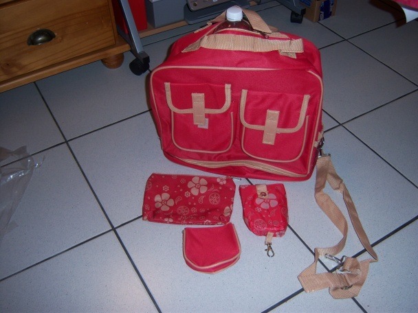 commande reçue ce jour, le sac week-end rouge est sympa, avec petite pochette, porte-monnaie et sac shopping de poche assortis. je vous mets une petite photo