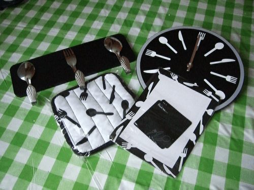 - l'ensemble déco cuisine : une horloge 25cm un patère 3 crochets dim 20x 8 cm et 2 magnets aimantés 3.8 x 5.3 cm