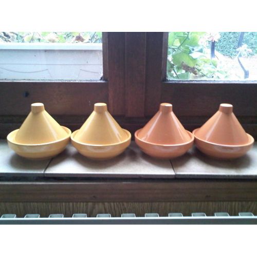 - les 4 plats à tajine jaunes et oranges en céramique vernissée et leurs couvercles diam 10cm H 10cm (passe au four, au micro onde et au lave vaisselle)