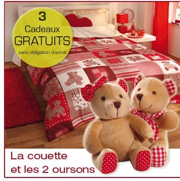 - la couette 2 personnes et ses 2 oursons façon patchwork 100% polyester dim 150 x 180 cm et 2 oursons H 11.5 cm