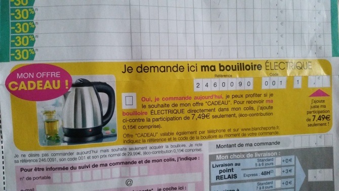 choiissez votre offre cadeau : raclette grill à 6,49euro ref; 8638044 CODE 001 OU la bouillore electrique à 7,49euro ref. 2460090 code 001 malheureusement FPP 5,99 PARKA GRIS GLACIER col fourrure amovible ref474.4453 à 3,99euro