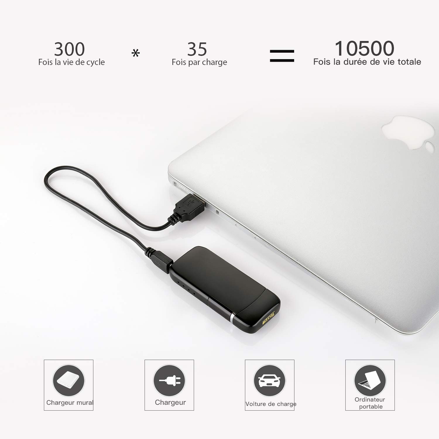 • 【Safe & Économie d'énergie】 - Qui vous permet de recycler jusqu'à utiliser après le chargement via USB. Longue durée de vie jusqu'à 300 charges et décharges. La capacité de la batterie est de 220 mAh, il ne faut que 1 heures pour le recharger complètement. Il peut être allumé plus de 150-200 fois en continu avec une seule charge.Ce briquet électronique ne produit aucune flamme, ne nécessite pas de gaz ou de fluide, et il est respectueux de l'environnement et d'économie d'énergie.