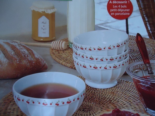 Juste reçu : cadeau : 4 jolis bols porcelaine rétro - geneviève lethu - blancs cotelés avec un motif de cerises tout autour