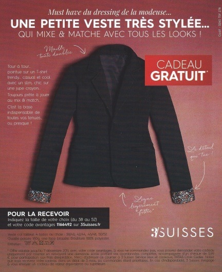 reçu hier pas de réduc mais en cadeau une veste noire cintrée (type tailleur) avec les bas de manche colorés, je la trouve sympa sur la photo