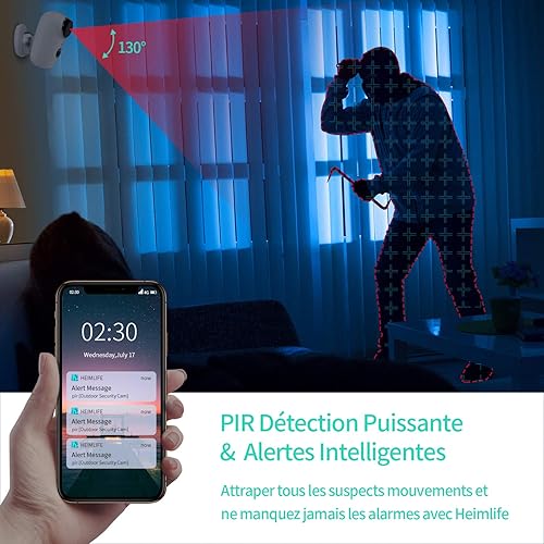 • 【Image de Haute Définition & Détection PIR】 Résolution 720P et 130° grand angle de HeimVision caméra surveillance wifi extérieure peut couvrir une distance de vision nocturne claire jusqu’à 10 mètres même dans l'obscurité et dans plan large. Capteur PIR peut détecter les mammifères à environ 37°C et vous envoyer des alertes en temps réels à votre téléphone grâce à HeimLife App.