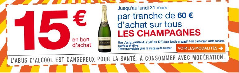 CARREFOUR : 15€ offerts en BA par tranche de 60€ sur les champagnes