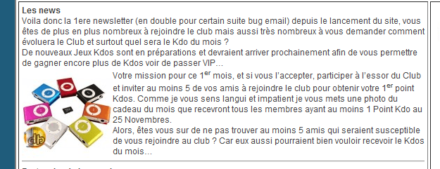 Votre mission pour ce 1er mois, et si vous l’accepter, participer à l’essor du Club et inviter au moins 5 de vos amis à rejoindre le club pour obtenir votre 1er point Kdos. Comme je vous sens langui et impatient je vous mets une photo du cadeau du mois que recevront tous les membres ayant au moins 1 Point Kdo au 25 Novembres.