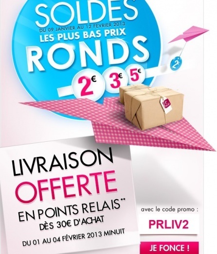 [FONT=Arial, Helvetica, sans-serif] **Offre "Livraison offerte dans les points relais" valable sur le site tati.fr du 01 au 04 février 2013 minuit pour une commande d'un minimum de 30euros (hors frais de port) avec une livraison en points relais uniquement (Kiala, Relais Colis ou Mondial Relay). Offre valable pour la France métropolitaine et la Corse, non cumulable avec d'autres promotions en cours et ne peut faire l'objet d'aucun remboursement en espèces ou d'aucune contrepartie de quelque nature que ce soit.[/FONT]