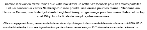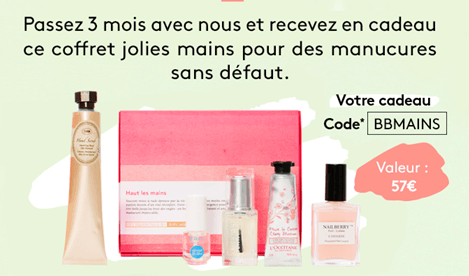 pour tout abonnement à la box (13e/mois) sous engagement de 3 mois la box mains d’une valeur de 57e est offerte avec le code BBMAINS