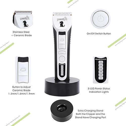 - ★50 dB Design silencieux supérieur: lame fixe en acier au carbone de haute qualité et lame nano céramique mobile, la tondeuse présente une surface claire et propre. Avec un faible coefficient de frottement, il évite de brûler la peau de votre animal de compagnie tout en réduisant le bruit au cours de toilettage.
