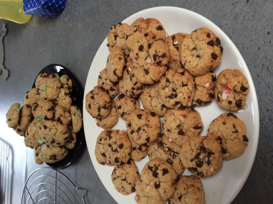 Une idée m'est venue : des cookies au chocolat et sucre d'orge Ne pouvant mettre qu'une photo je vous mets le résultat J'ai diminué le poids de sucre du poids du sucre d'orge sur ma recette habituelle