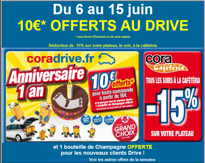 Bonjour, du 6 au 15 juin et à partir de 50€ d'achat cora drive vous offre 10€ sous forme de carte cadeau ou d'eurocora,et en plus pour tout les nouveaux clients une bouteille de champagne offerte.:)