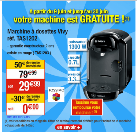 Bonjour, du Vendredi 6 Juin au Mardi 10 Juin la tassimo TAS1202 est gratuite grâce à une réduction immédiate de 50€ et un remboursement différé de 30€ pour l'achat de 3 paquets t-disc.
