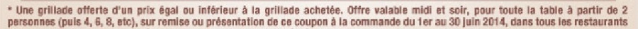 :arrow: 40 % sur les grillades midi et soir, du 01/06 au 31/10, pour toute la table mais limité à 1 grillade/personne
