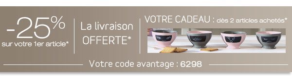 Profitez de votre offre 25% sur votre article préféré, les bols offert dès 2 articles achetés et les frais de port gratuit...