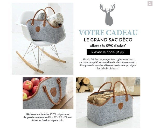 je leur avais envoyé un mail pour savoir si je pouvais obtenir le sac déco sans commande mais en le payant. Leur réponse : non, ce sac est uniquement offert pour 89 euros d'achat :icon_twisted: sont pas commodes chez cyrillus :idea: