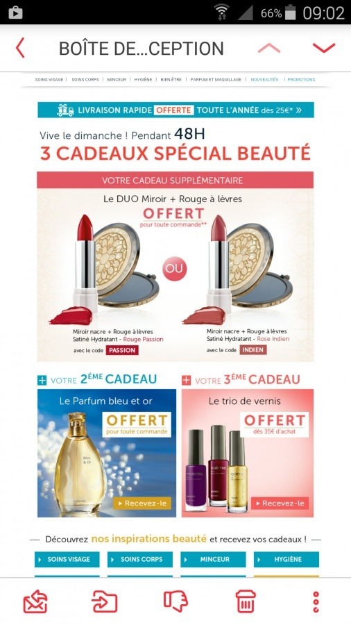 lilo Super Modérateur Membre de l'équipe 13 Mai 2007 64 698 15 444 10 810 15 Février 2015 #3 Merci phuongpham, en clair valable jusqu'au 16/02 23h59. Vous avez saisi le code avantage « PASSION » DUO Miroir Nacre + Rouge à lèvres Rouge Passion OFFERT Vous avez saisi le code avantage « INDIEN » DUO Miroir Nacre + Rouge à lèvres Rose Indien