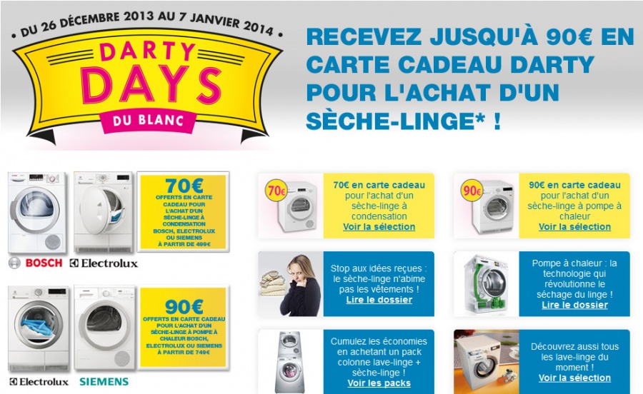 Du 26 décembre 2013 au 7 janvier 2014, Darty lance l'opération " Darty Days du blanc" ! Recevez jusqu'à 90 euros en carte cadeau Darty pour l'achat d'un sèche linge de la sélection. Jetez-y un oeil si vous envisagez un tel achat.