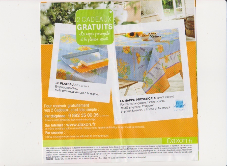 code 1460 20% sur mon gros catalogue automne hiver. fdp gratuits si commande 40€ ou +. en cadeau : la nappe provencale et son plateau. .
