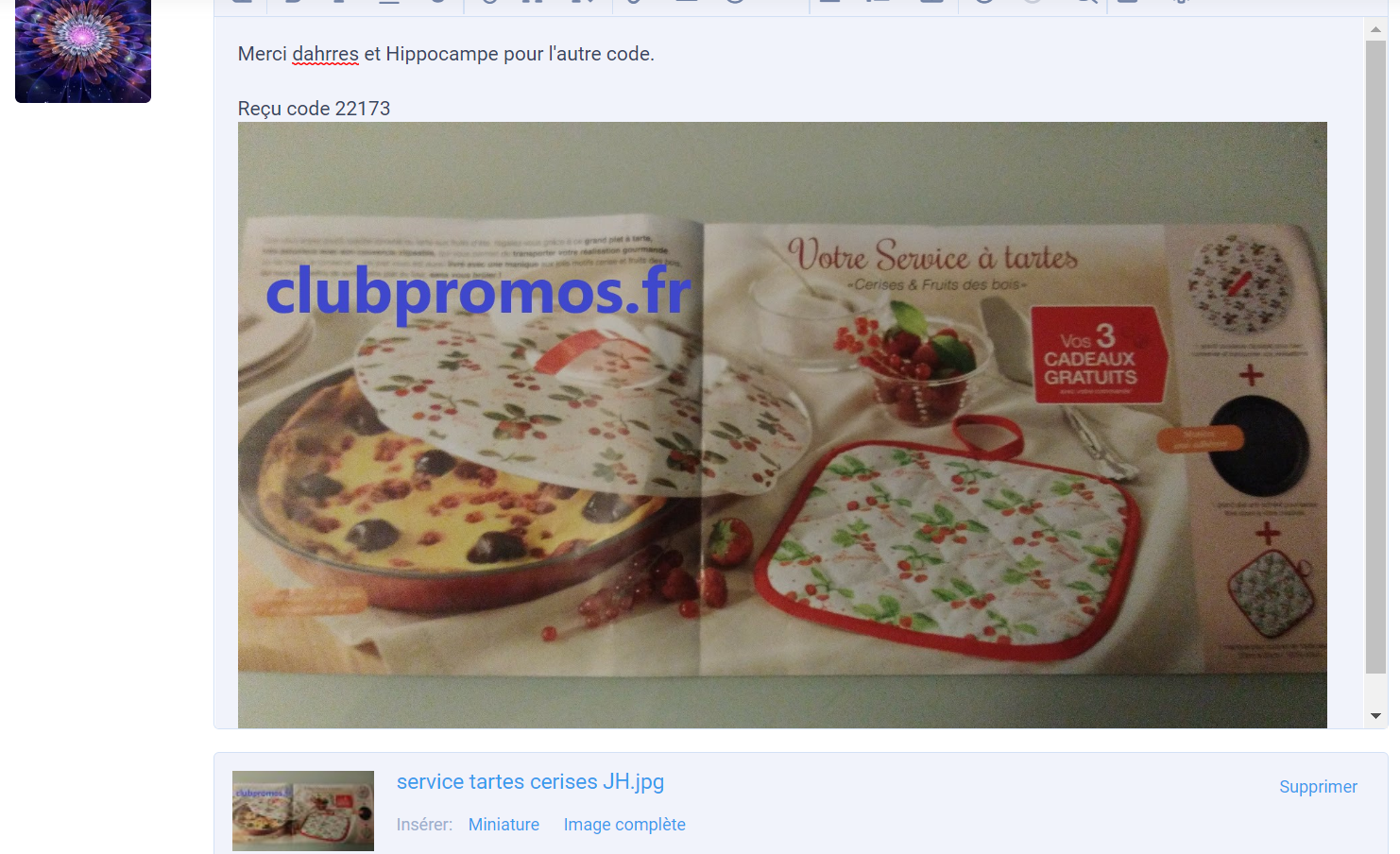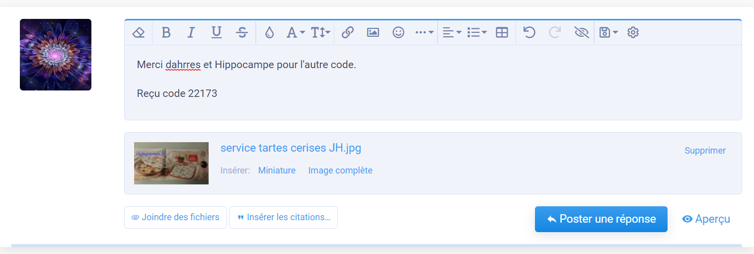 Bonjour, quand tu as joint un fichier tu sélectionnes image complète et elle s'affiche en grand dans ton message.Merci par avance pour l'agrandissement de mes photos ? c'est gentil à chaque fois de le faire ( je ne sais pas comment l'on fait ). Sinon je voulais savoir s'il était possible d'empêcher le vol de photos sur le forum car en surfant sur le net j'ai reconnu l'une de mes photos sur deux sites de bons plans ? cela concerne un code promo que j'avais posté il y a quelques mois ( Daxon 3 bracelets en cadeau ) et il s'agit bien d'une de mes photos car on voit un peu ma nappe. Ça me dérange pas de partager mes bons plans bien au contraire mais les gens pourrait demander avant de se servir ( question de respect , de politesse ).