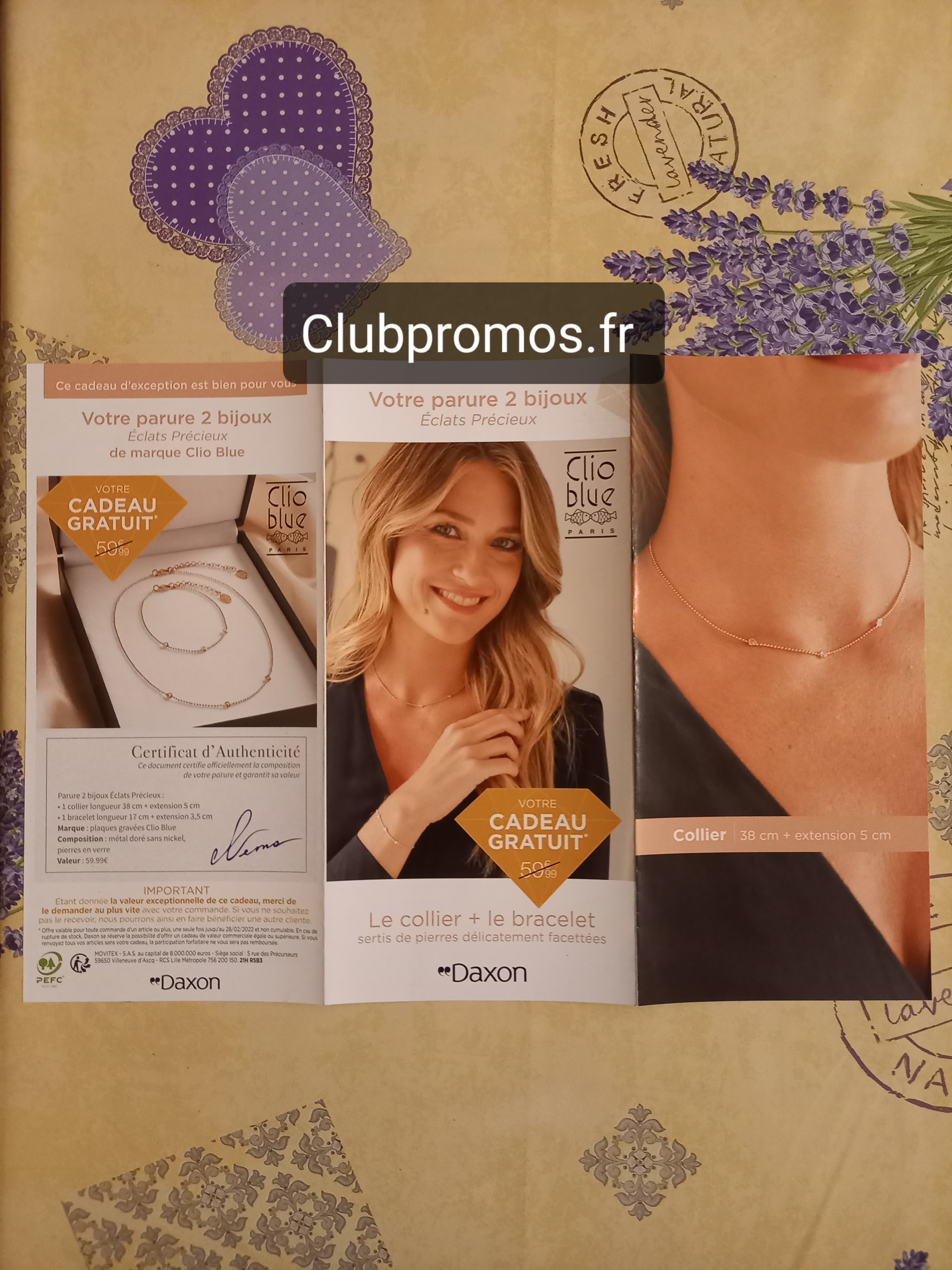 Voici le code [Message caché]de chez Daxon qui donne en cadeau ? pour toute commande une jolie parure Éclats Précieux de marque Clio Blue (collier + bracelet), valeur 59,99 euros, voir photos ?, (ça peut faire un petit cadeau sympa pour les fêtes ?). Il y a aussi une remise de 40% sur toute votre commande ainsi qu'une autre remise de 10% supplémentaire special web. Les frais de port sont offerts dès 2 articles achetés.