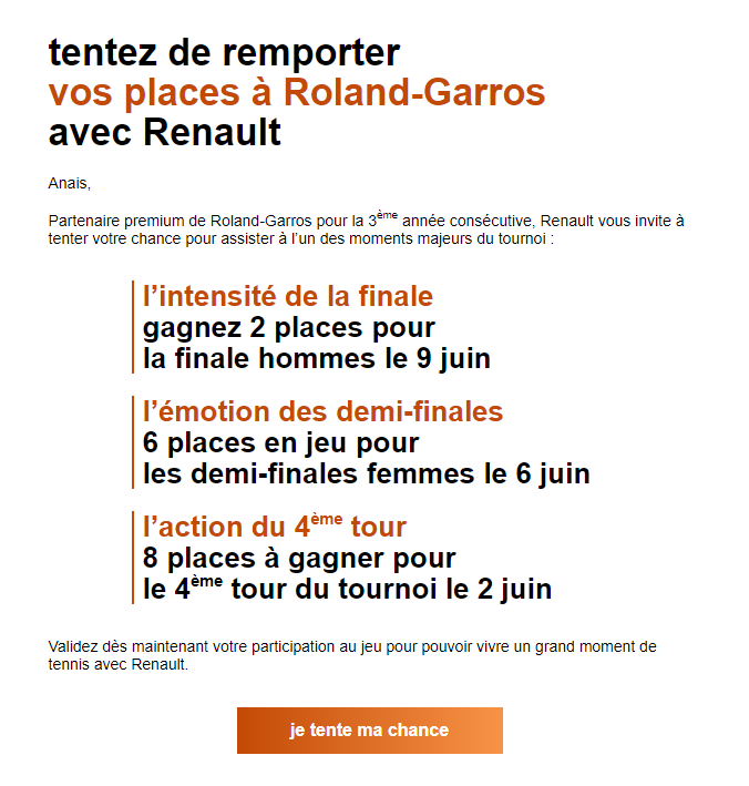 Renault organise un petit jeu concours pour Roland-Garros où vous pouvez gagner des places gratuites juste en remplissant le formulaire !
