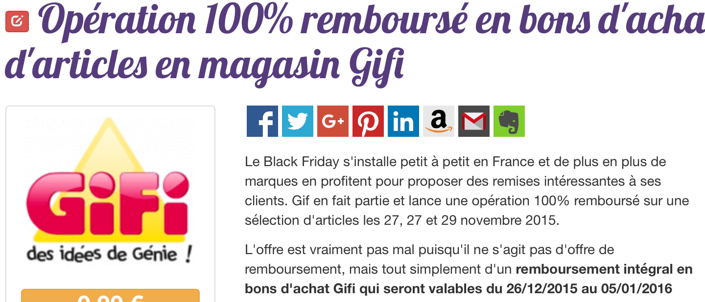 Du 27 novembre au 29 novembre retrouvez dans vos magasins GIFI des produits 100% remboursés en bons d'achat qui eux seront à utiliser du 26/12/15 au 26/01/16.