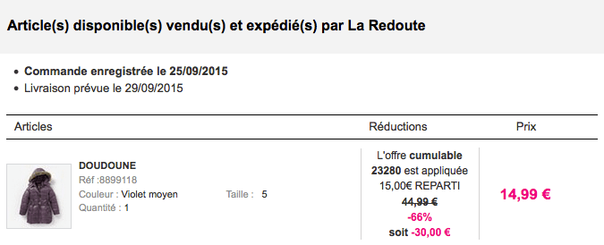 Avec les code alpha, cette doudoune (dispo en noir ou violet) à 45€, qui est déjà remisée à 30€ revient à 15€ avec un code alpha