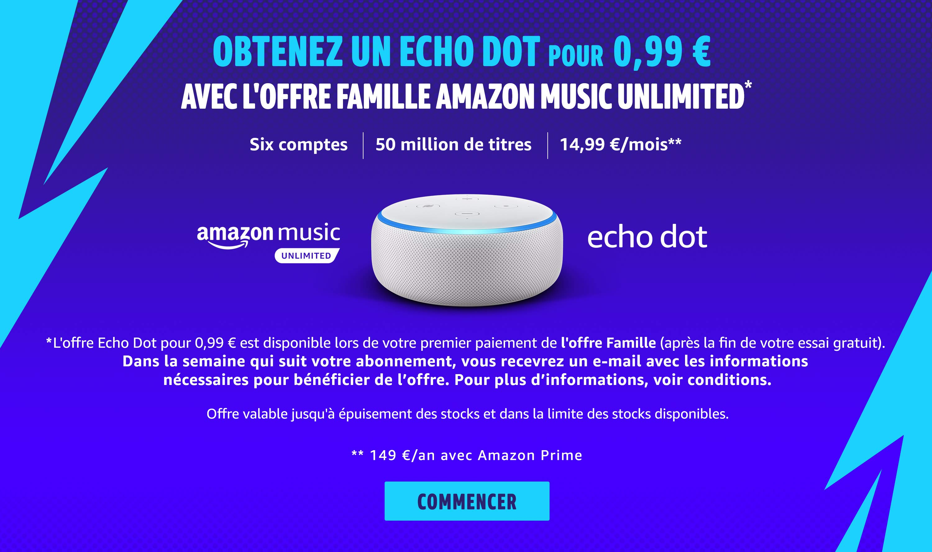 • La présente offre est réservée aux abonnés à l’offre Famille Amazon Music Unlimited payante et permet d'acheter un appareil Echo Dot pour 0,99 €.