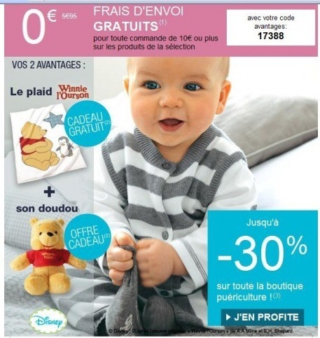 bonjour reçu par mail ce code : 17388 fdp 0€ pour 10€ cadeau : plaid winnie l'ourson + doudou valable jusqu'au 15 mars bonne commande :icon_wink: