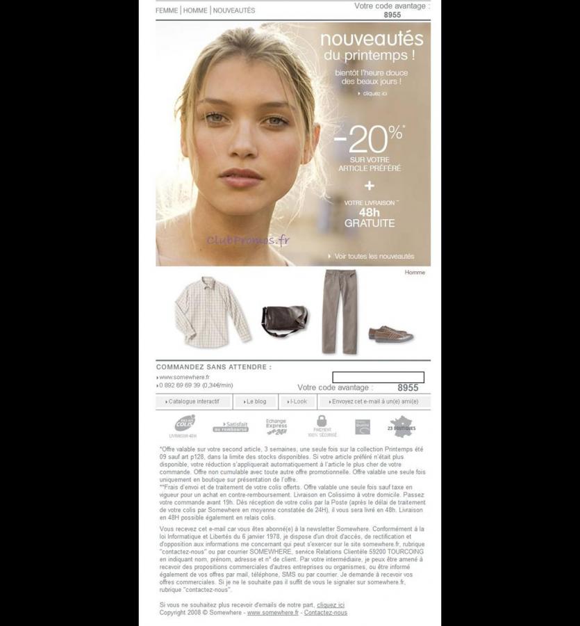 ! *Offre valable sur votre second article, 3 semaines, une seule fois sur la collection Printemps été 09 sauf art p128, dans la limite des stocks disponibles. Si votre article préféré n’était plus disponible, votre réduction s’appliquerait automatiquement à l’article le plus cher de votre commande. Offre non cumulable avec toute autre offre promotionnelle. Offre valable une seule fois uniquement en boutique sur présentation de l’offre.