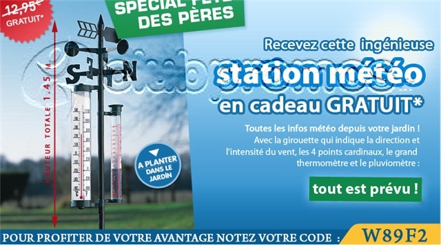 *Offre non cumulable, valable uniquement sur internet jusqu'au 24/06/08. Si vous ne souhaitez pas commander, vous pouvez néanmoins recevoir votre station météo multifonctions en envoyant votre demande sous enveloppe neutre affranchie à l'adresse suivante : Willemse France - service internet - 59984 Tourcoing Cedex, en joignant un chèque de 5,99 euros pour participation aux frais de traitement et de mise à disposition. Encas d'indisponibilité, Willemse France s'engage à remettre un cadeau d'un prix de revient égal ou supérieur.