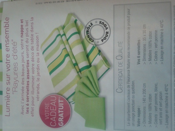 Fleurance: nappe 140x200 cm + 6 serviettes assorties en kdo