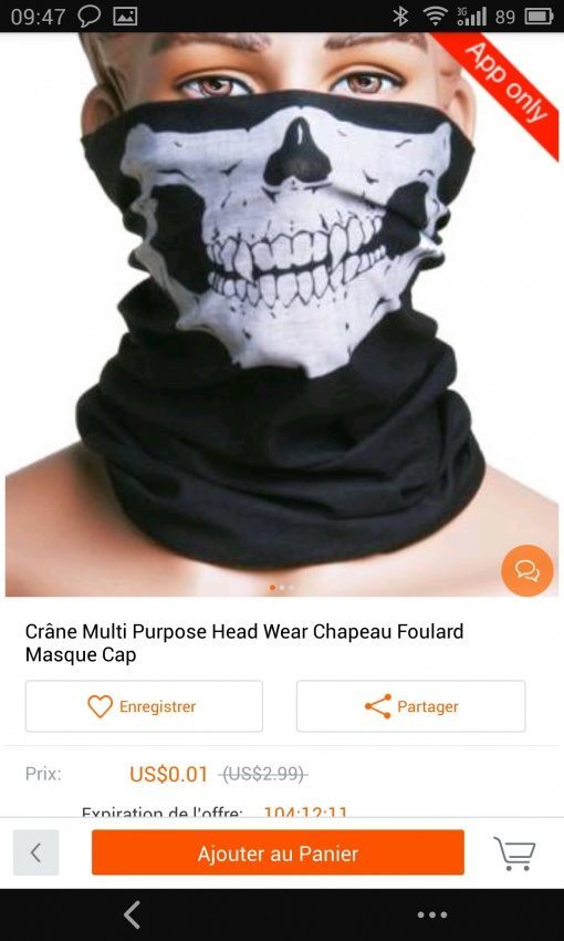 Nouveau deal intéressant sur Bannggood qui propose en plus des autres produits dont nous avons récemment parlé, un foulard / bandana Squellette pour 0.01€.