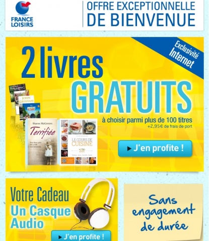 France Loisirs Offre de bienvenue 2 livres gratuits + casque audio France Loisirs Offre réservée aux nouveaux adhérents du Club valable jusqu'au 24/03/2013