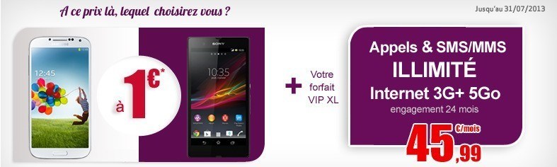 Je viens de voir sur le site Virgin mobile que le Samsung Galaxy S4 et le Sony Xperia Z sont à 1€ au lieu de 99€ pour la souscription d'un forfait IDOL VIP XL( qui est à 45.99€/ mois), avec engagement de 24 mois. :idea: