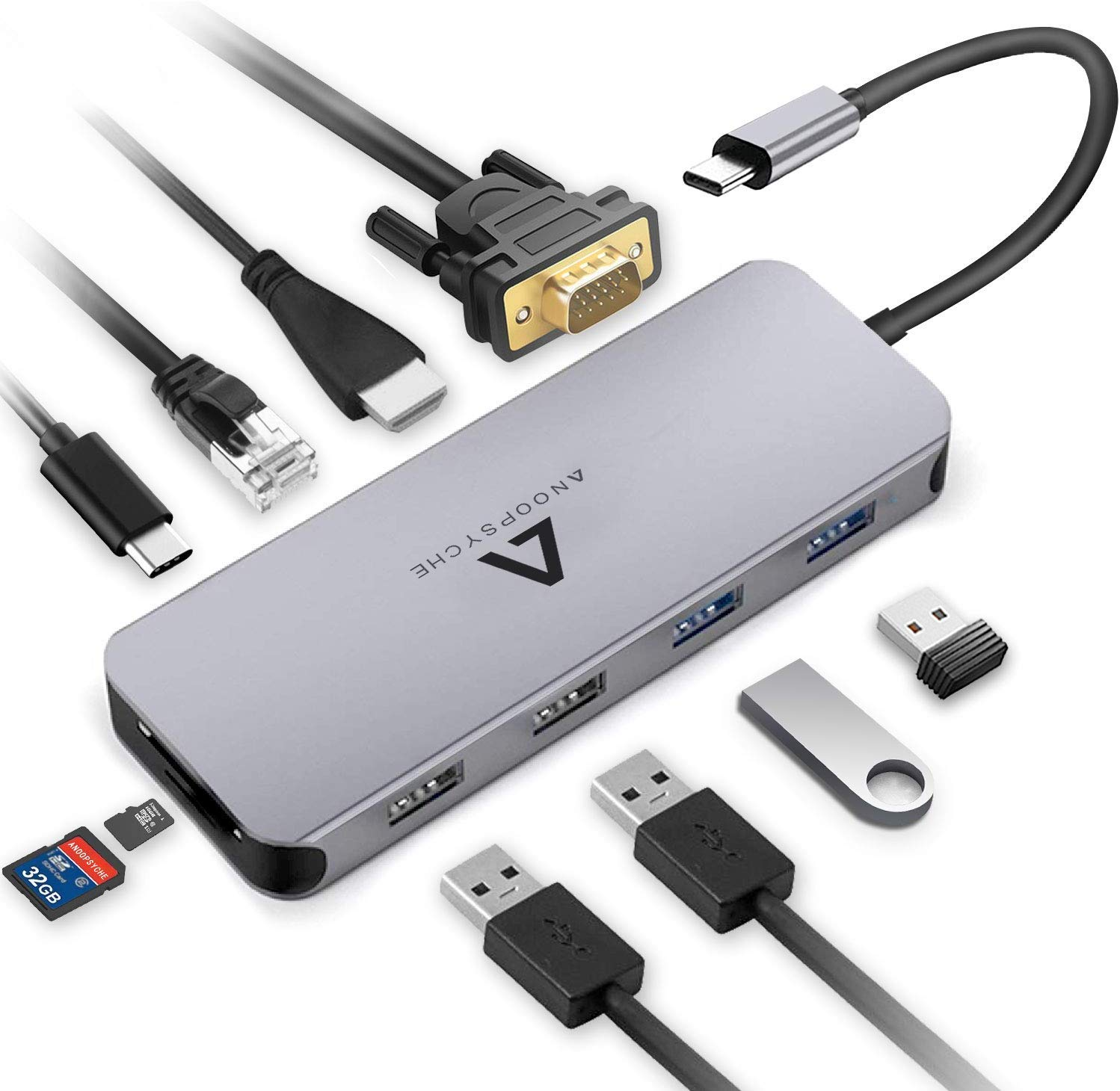 - 【10-en-1 Hub USB C - Plug-and-Play】ANOOPSYCHE 10-en-1 Hub Type C fournit 1 x Power Delivery 100W, 1 x HDMI 4K, 1 x VGA 1080p, 2 ports USB 3.0 et 2 ports USB 2.0, 1x Lecteur Carte SD et 1x Lecteur Carte Micro SD/TF, 1 x Gigabit Enthernet 1000Mbps, hub USB C multifonction pour répondre à vos divers besoins