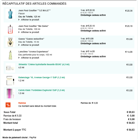 Voici ma commande (voir capture) n'oubliez pas de cocher la case "emballage cadeau" cela permet d'amortir en cas de chocs si vous avez commandé plusieurs flacons en verre, les frais de port sont gratuit à partir de 60€ d'achat et il y a le code RADSOLDES qui permet d'avoir une réduction de 5€ à partir de 50€. :)