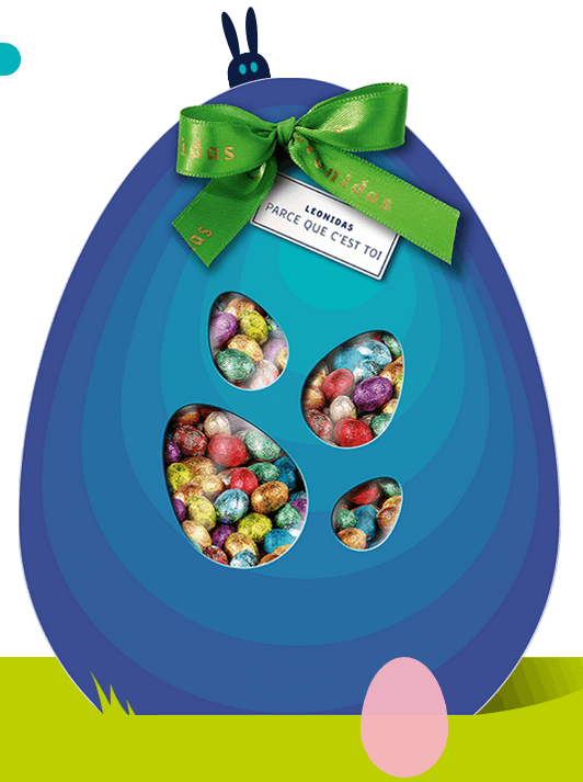 Gagnez des œufs géants Leonidas pour Pâques. D’après le règlement du jeu, le gain mis en jeu dans chaque point de vente est un œuf en carton rempli de 250 petits œufs Leonidas 100% pur beurre de cacao.